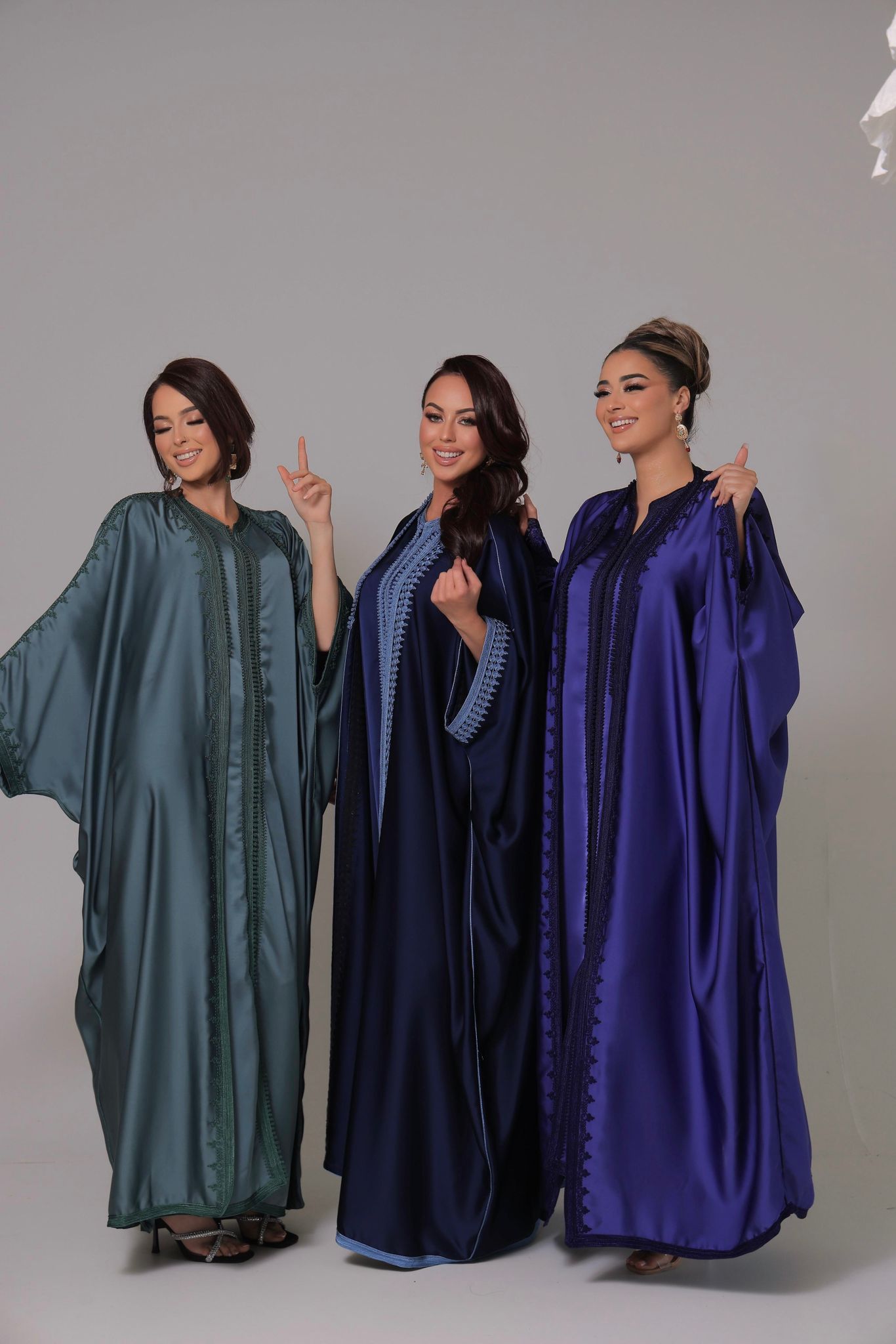 Links wordt de kimono getoond in Jade Al Arab, een zachte blauwgroene tint met een elegante uitstraling. In het midden zie je Sapphire Nooré, een diepe en luxueuze nachtblauwe kleur. Rechts straalt Ameerah, een rijke koningsblauwe tint die kracht en elegantie uitstraalt.